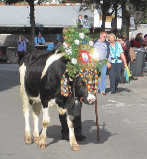 It was the last Almabtrieb for this summer in Mayrhofen yesterday. Almabtrieb is when the farmers bring their cows down to the valley from the high pastures where they have been all summer. Traditionally, it was a good excuse for a party. The tradition has continued and now it is a great day out for locals and tourists. The cows walk down to the valley in the morning, sometimes as far as 30kms. They are then cleaned up, decorated with flowers and are walked down the main street. Tourists come to watch the cows and take pictures of them in their finery. They also enjoy the beer and Bratwurst, music and dancing, and, of course, the schnapps!