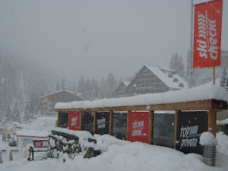 Leaving Fügen this morning wasn’t very inspiring. It had been raining all night in the valley and it was still raining on the drive up to Hochfügen. It changed to snow at about 1400m. There was about 5cm in the car park at 08:30… and then it snowed all day!