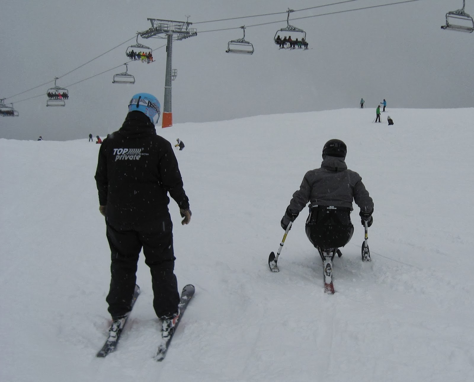 Then… Today it snowed… and it snowed all day 🙂 Early this morning there was about 30cm on piste, which made skiing with a beginner monoskier a bit tricky. As the day went on and the snow was skied out in some ways it became easier, though staying on the snow as the monoski bounced over the bumps that had formed later in the day was a challenge!
